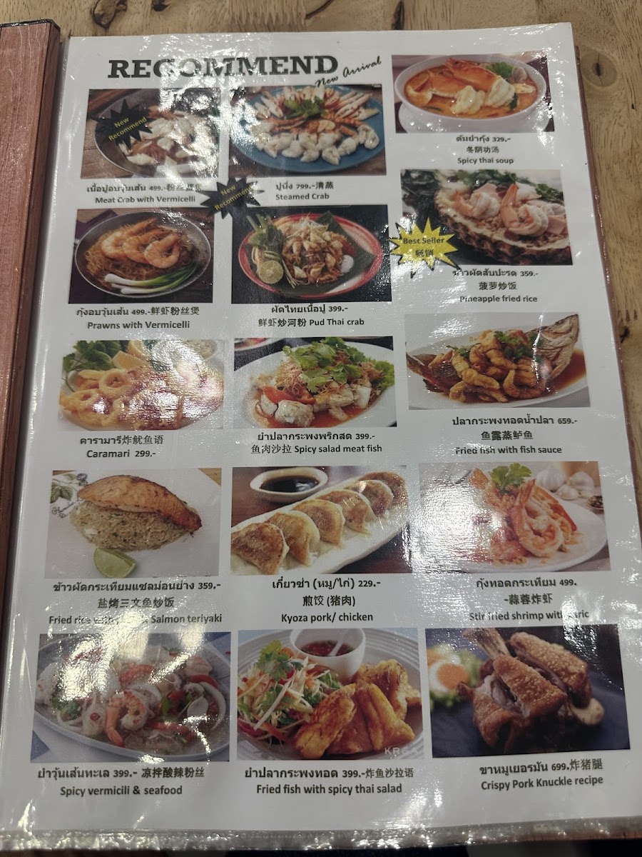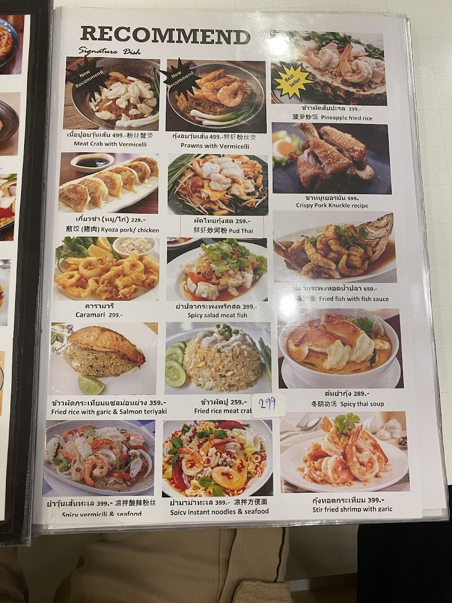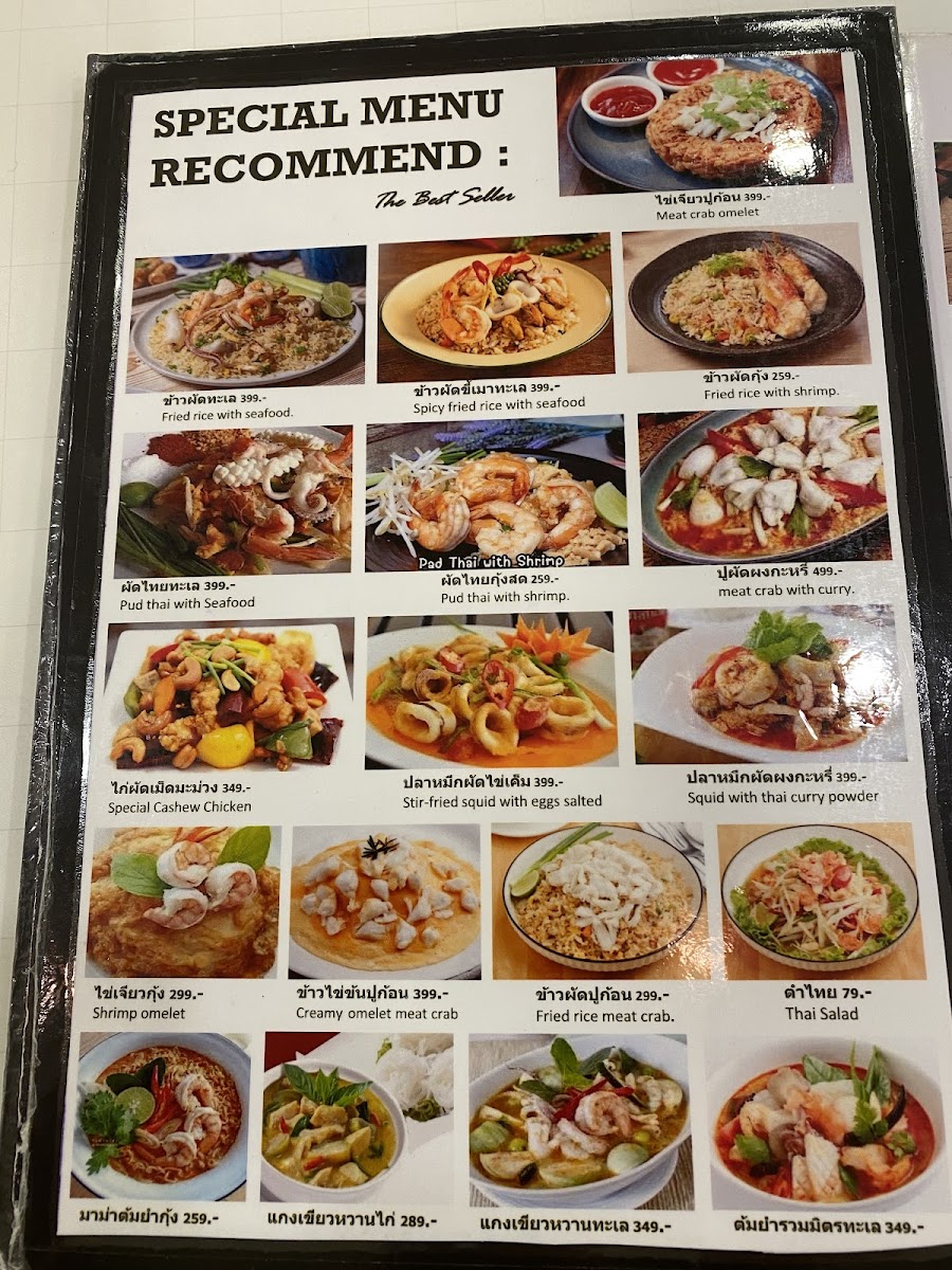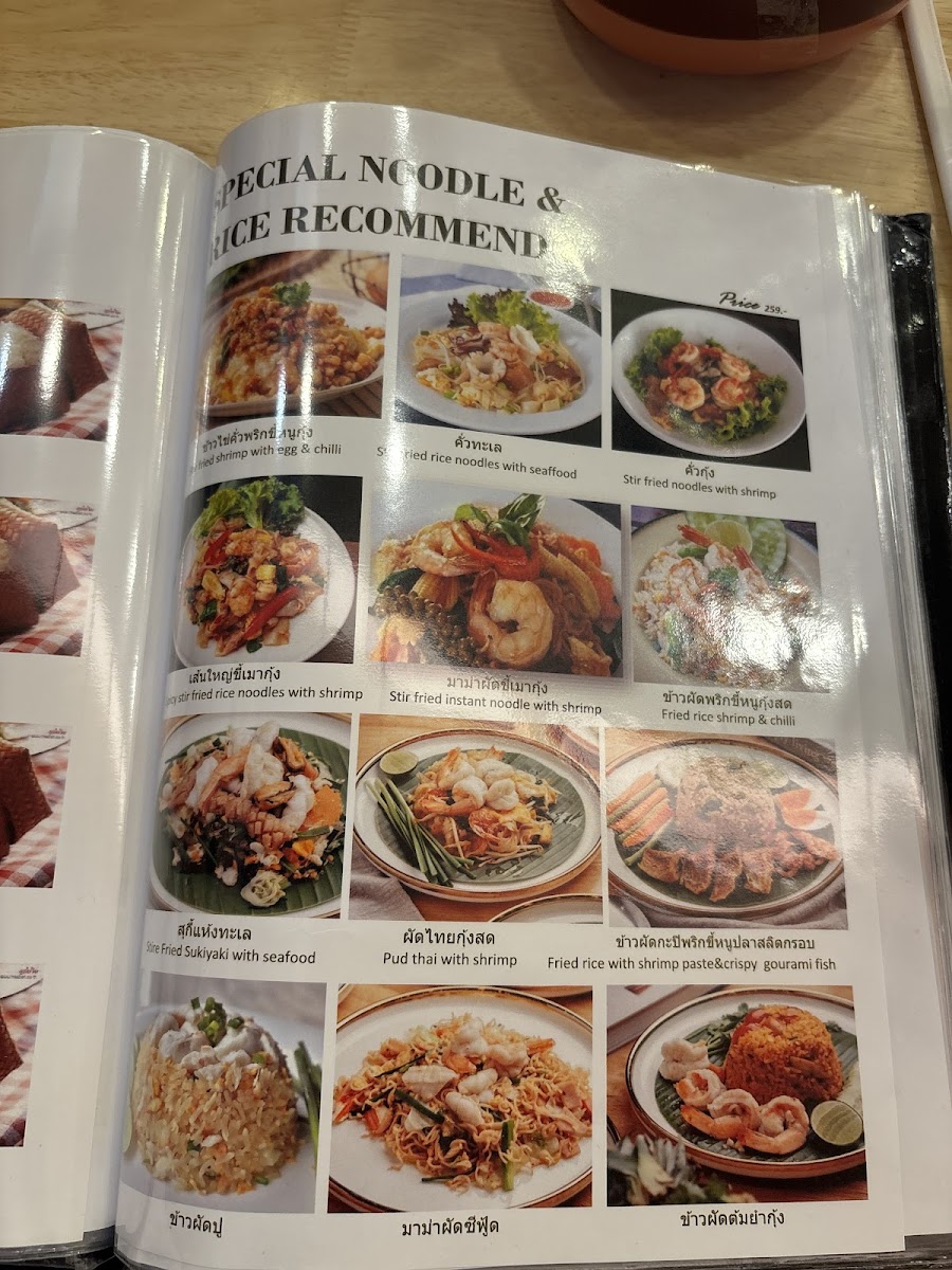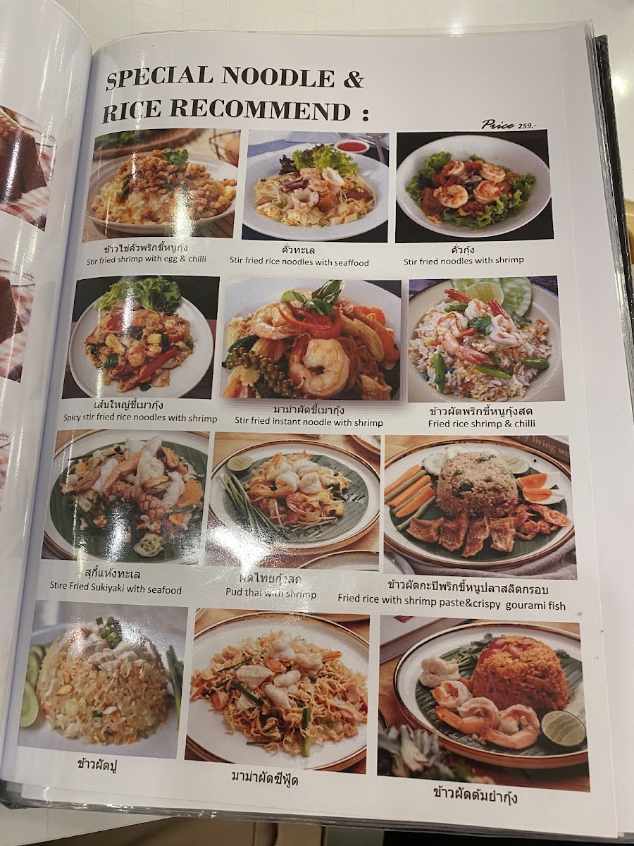 - Main Dishes and Light Meals: Featuring noodles like Pad Thai, seafood variations, and rice dishes including crab meat fried rice.